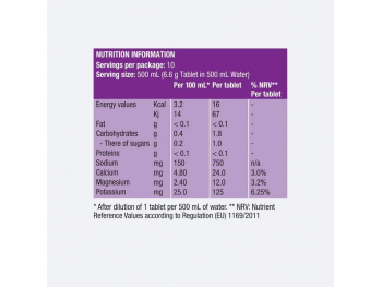Dissoudre 1 pastille dans 500 ml d’eau avant, pendant ou après un effort très intense, ou lorsqu’il y a sudation importante. Peut aussi être utilisé les jours de forte chaleur ou lors d’activités longues. Ne pas dépasser la dose recommandée.